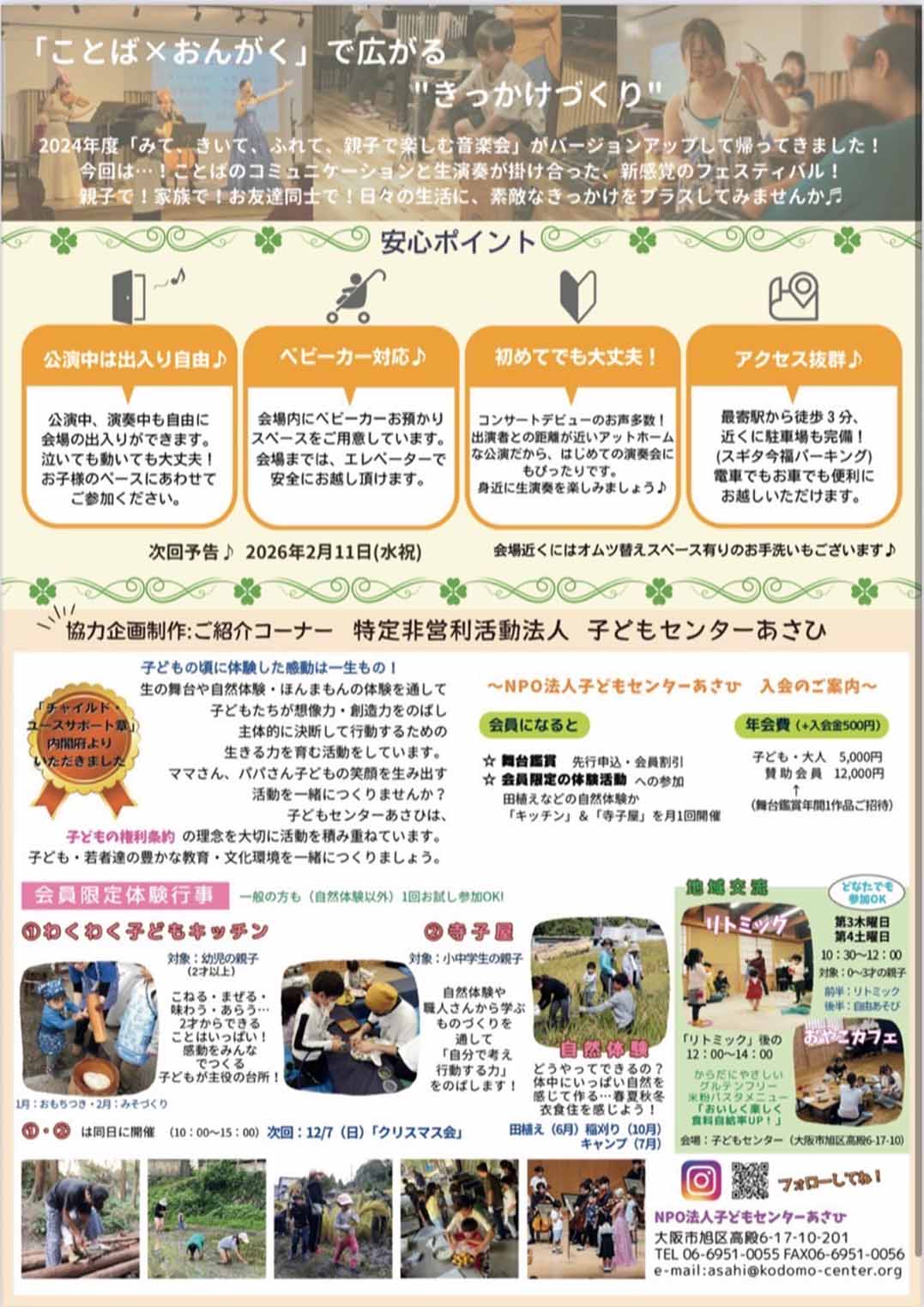 言葉のリズムと生演奏を組み合わせ、親子で楽しめる参加型プログラム。楽器体験やことばあそびを通じ、0歳から安心して参加できる構成。豊富なアクティビティ&ことばあそび体験、楽器体験、0歳から入場可能。新作組曲《どうぶつさんと、かくれんぼ!》初演。